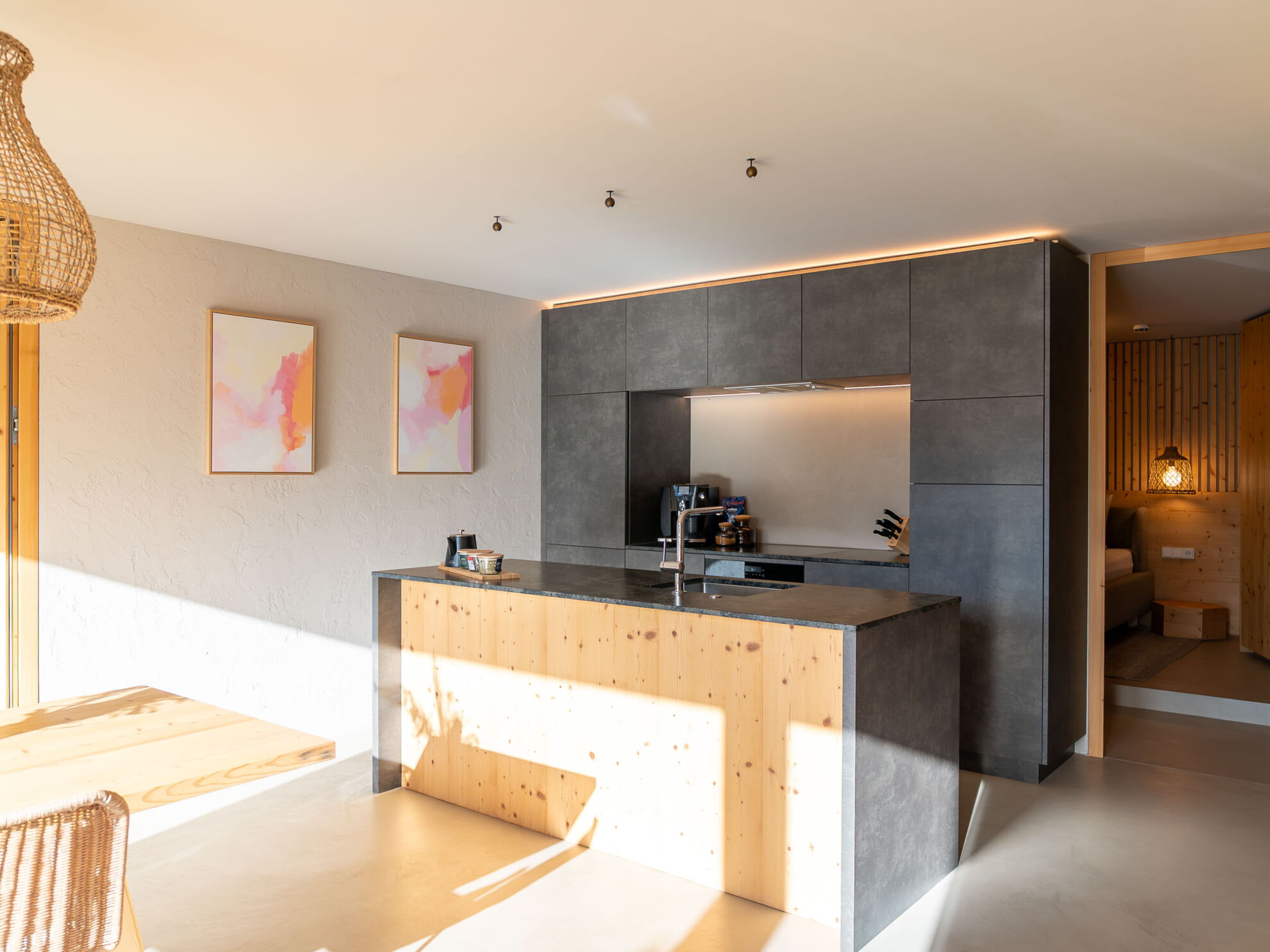 Die Küche ist voll ausgestattet – inklusive hochwertiger Geräte, Geschirr und allem, was ihr für gemeinsame Kochmomente braucht. Vom Induktionskochfeld über Backofen, Spülmaschine und Weinkühler bis hin zum Jura Kaffeevollautomat für den perfekten Start in den Tag – hier bleibt kein Wunsch offen.