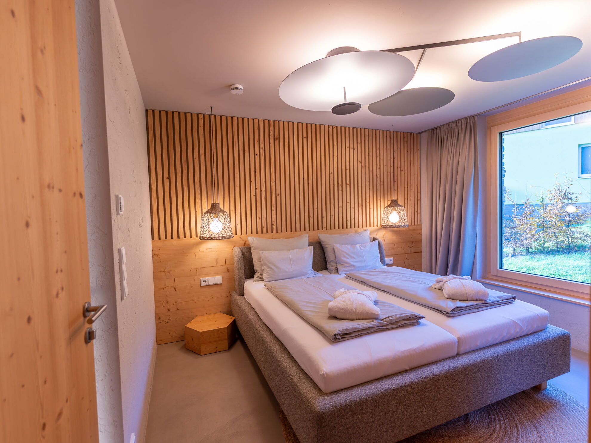 Das Hauptschlafzimmer ist euer persönlicher Ruhepol. Ein großzügiges Doppelbett (200 × 200 cm) mit hochwertigen Matratzen, sanfte Beleuchtung und warme Materialien schaffen eine ruhige, wohnliche Atmosphäre. Direkt angeschlossen: euer privates Bad en Suite mit Dusche, Waschbecken und WC. So beginnt und endet jeder Tag in eurer eigenen Wohlfühlzone – ohne Kompromisse in Sachen Privatsphäre.