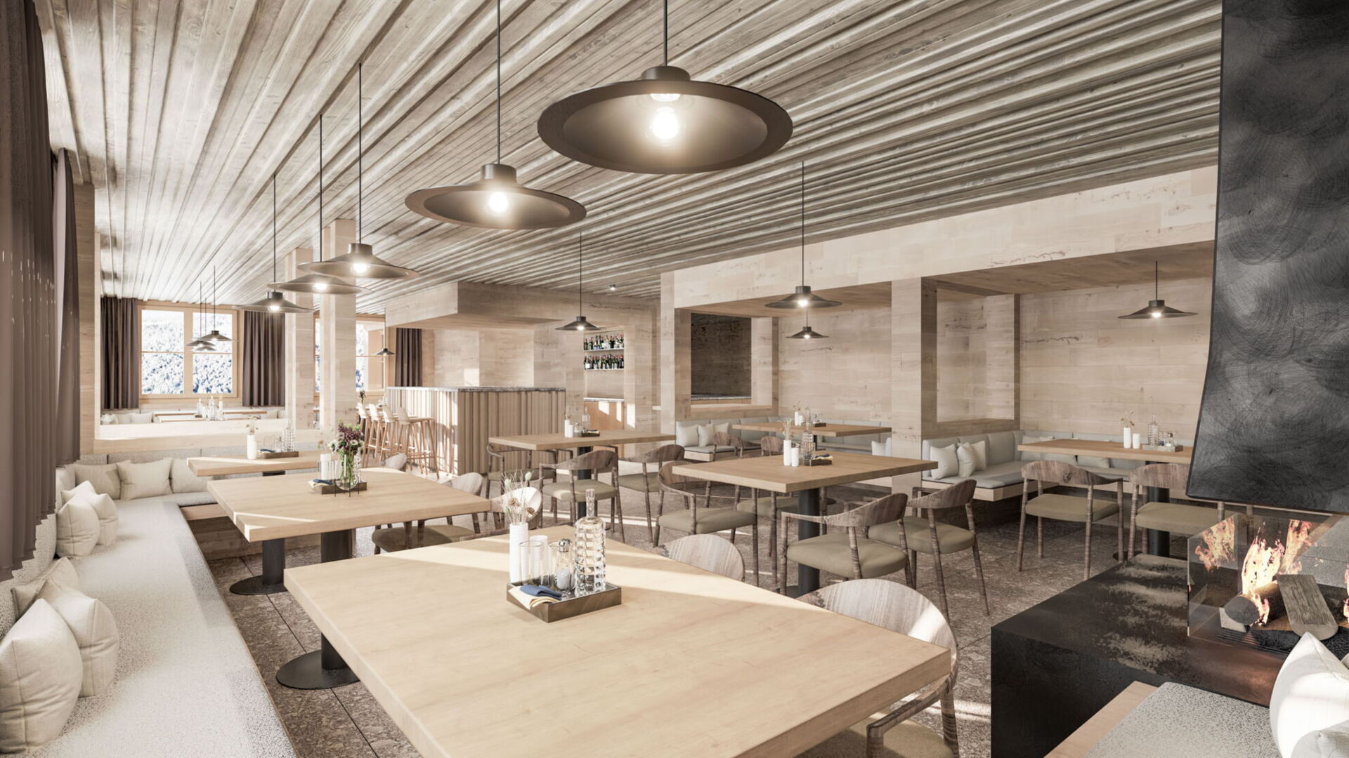 Drinnen sorgt das warme Design mit Holz, Stein und Naturtönen für eine gemütliche Atmosphäre – draußen eröffnet sich der Blick auf die weiten Wiesen und Gipfel von Balderschwang.