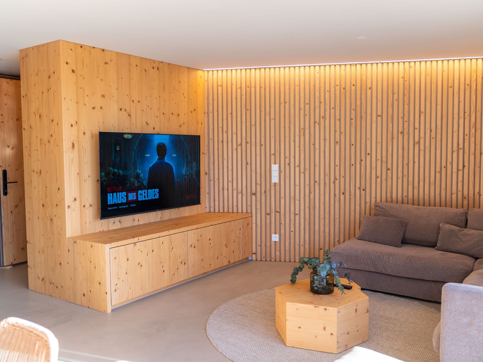 Für den entspannten Abend sorgen ein 65-Zoll-HD-TV, Netflix, und ein Teufel Soundsystem, das euren Lieblingssound in jeden Winkel bringt. Und das Sofa? Kein Schlafsofa, sondern ein echtes Statement in Sachen Komfort.