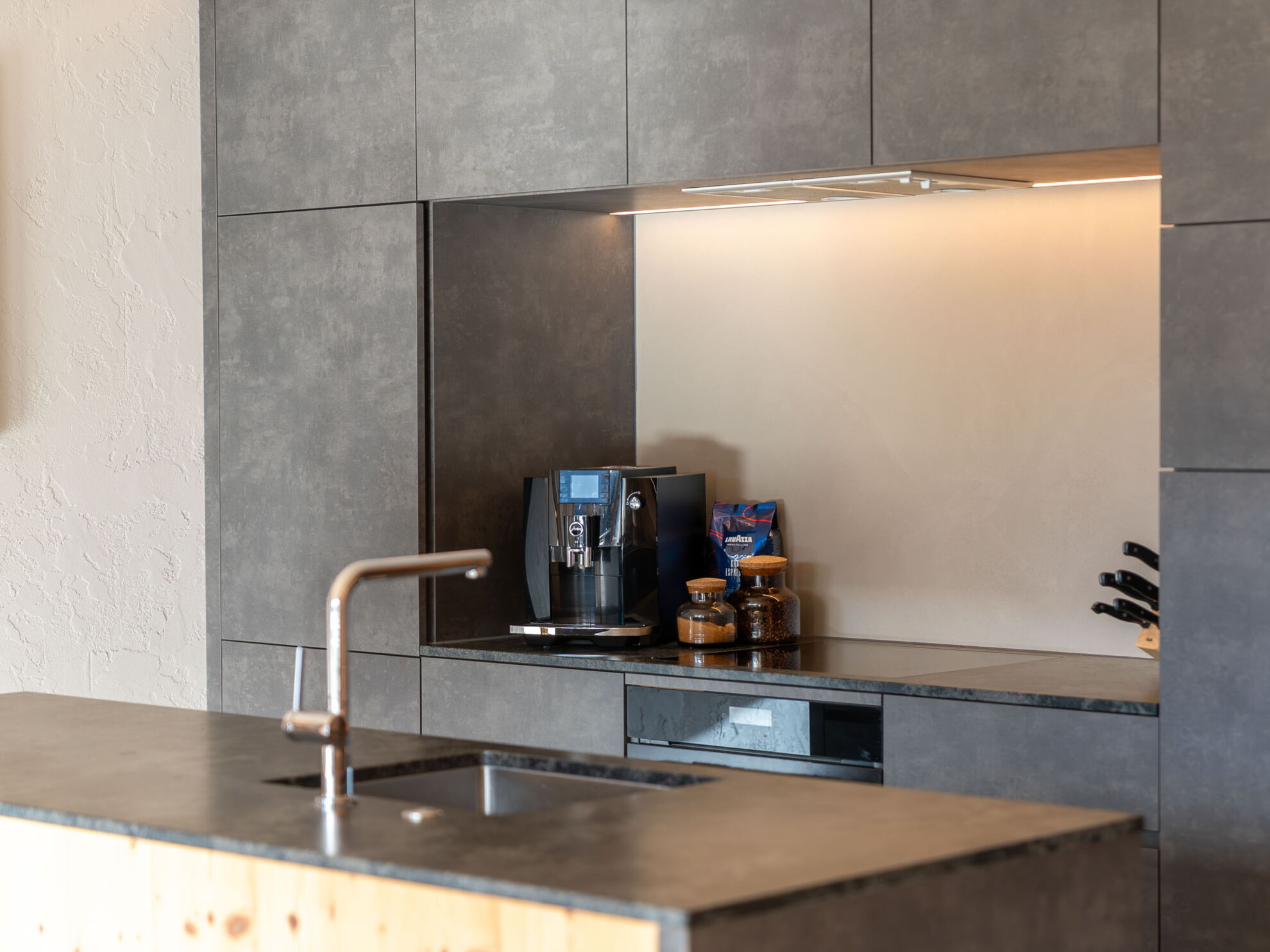 Die Küche ist voll ausgestattet – inklusive hochwertiger Geräte, Geschirr und allem, was ihr für gemeinsame Kochmomente braucht. Vom Induktionskochfeld über Backofen, Spülmaschine und Weinkühler bis hin zum Jura Kaffeevollautomat für den perfekten Start in den Tag – hier bleibt kein Wunsch offen.